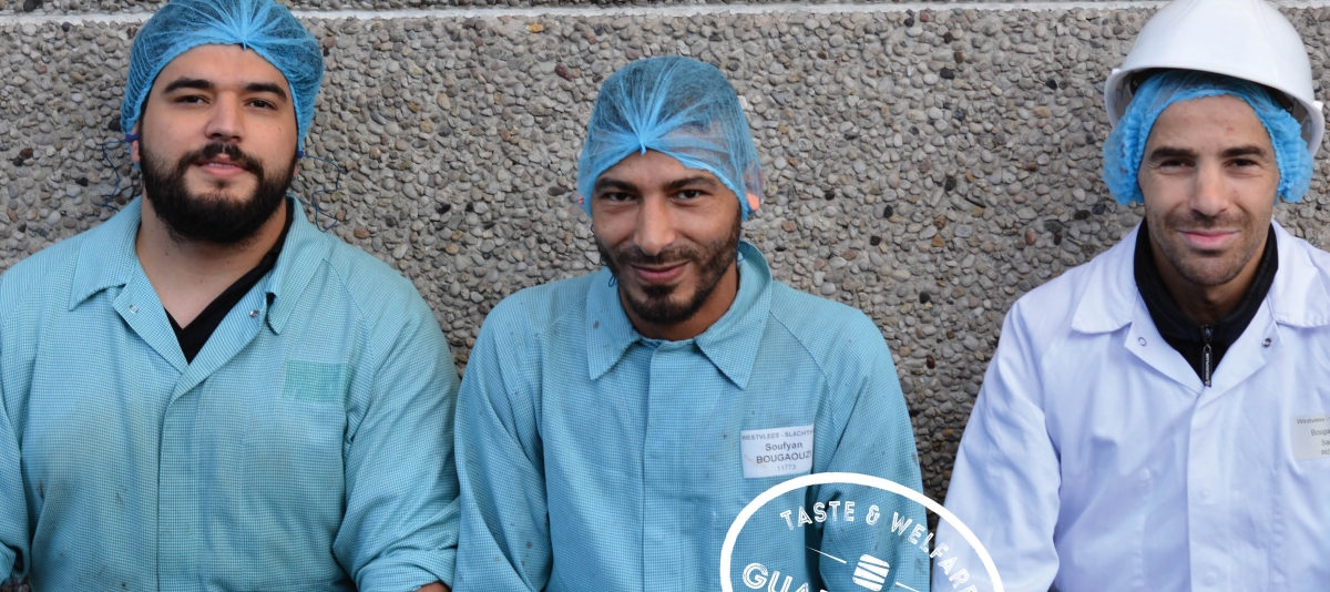 Ayoub: Na het werk van Soufyan en andere collega’s dienen diverse reinigingsmaatregelen ondernomen te worden. Hierna komt mijn werk aan de beurt. Door de voorgaande processen kan ik op een correcte manier starten met het ontleden van het karkas. Soufyan: Bij dit alles help ik ook bij de kwaliteitscontrole. Ik volg bijvoorbeeld de temperatuur van het waterbad op en ruim het vlees op dat op de werkvloer terechtkomt. Zo dragen we ertoe bij dat alleen het beste vlees over onze verschillende afdelingen verdeeld wordt.
