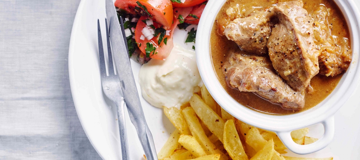 Stoofpotje van Varkenswangen met Frietjes & Gemarineerde Tomaten - Glenn Desimpel